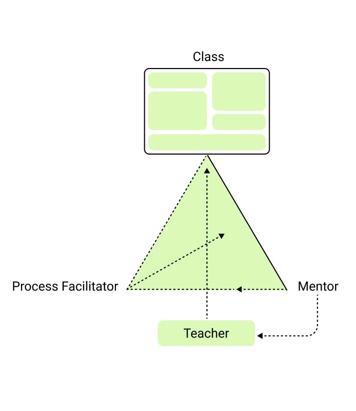 The implementation of the WKS model enables the teacher to maintain control over a class and to focus on the students' development process – both didactically and communicatively. According to the WKS model, a teacher acts as a daily facilitator. In this role, they empower students to develop their own solutions. The teacher examines the students' solutions and, if necessary, adjusts the decision-making framework. Another teacher plays the role of process facilitator. The process facilitator always remains outside the problem. They support communication between teachers and students, and between students themselves, without expressing their own opinions.